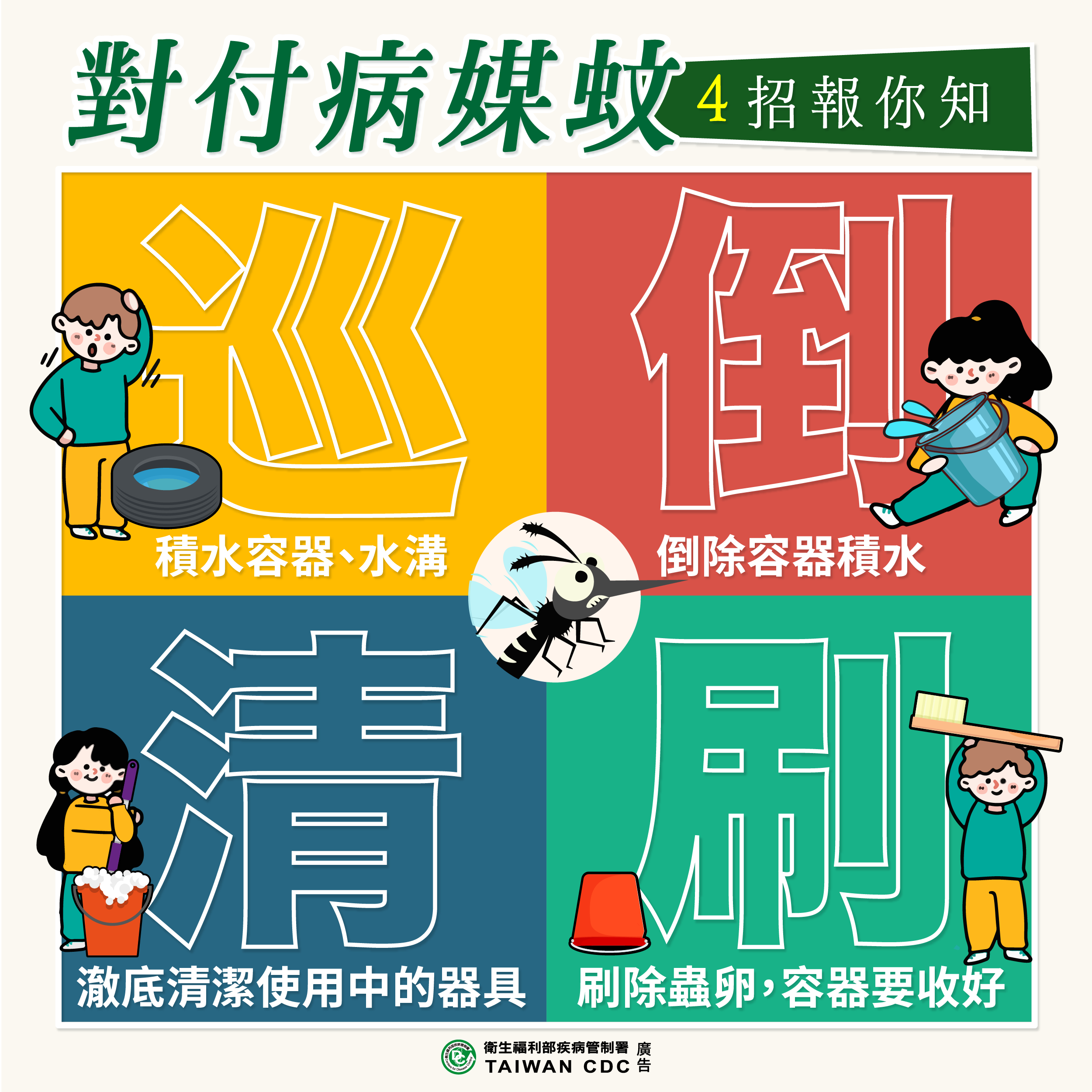 1.落實巡、倒、清、刷,一同預防登革熱。